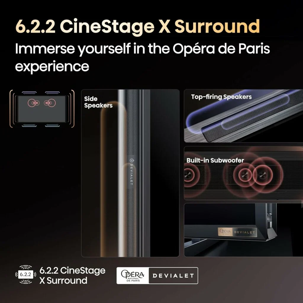 - Cinematic Audio: An integrated 6.2.2 multi-channel system tuned by Devialet, offering an immersive “Opéra de Paris” sound experience.